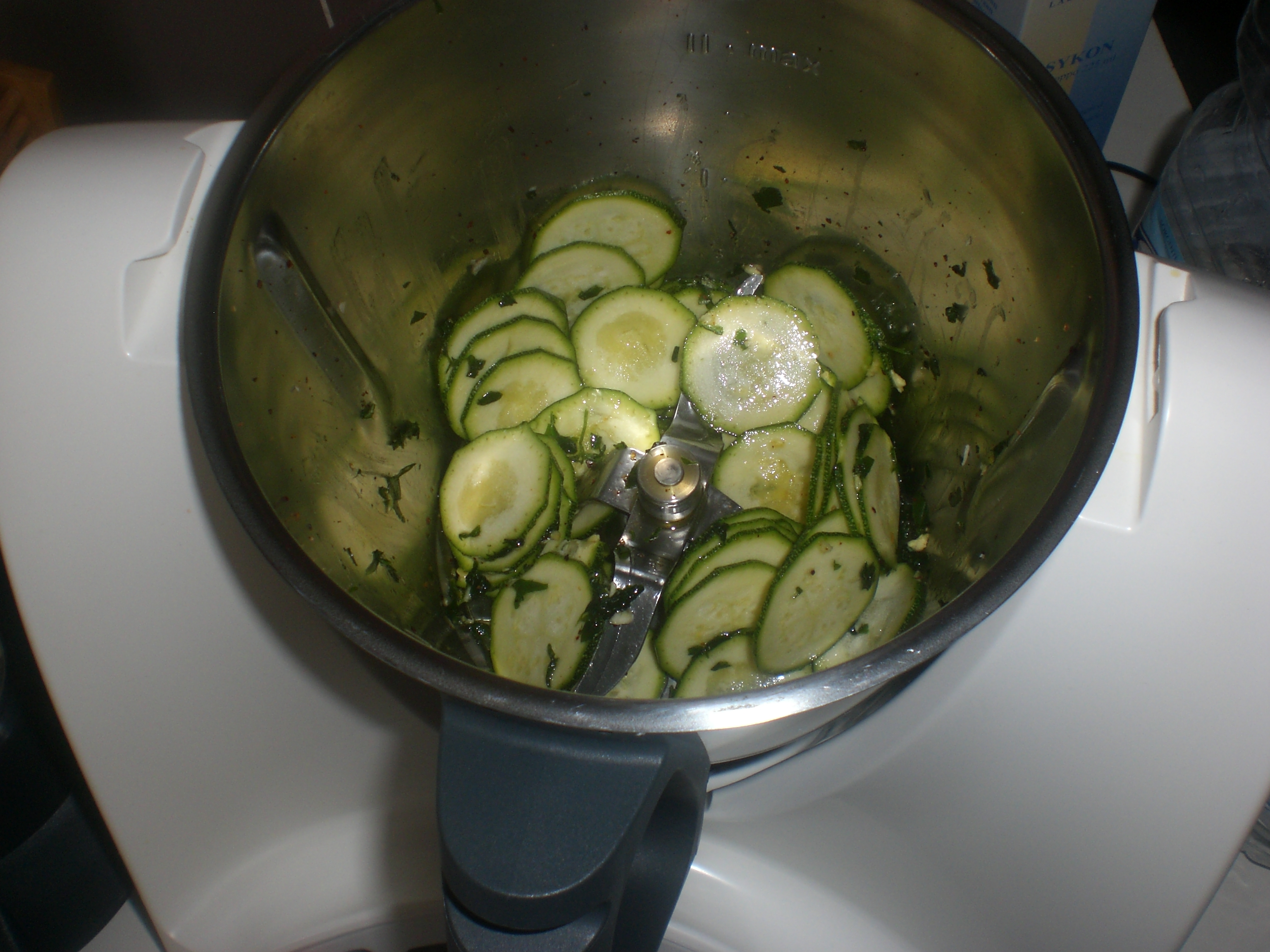 "coperchio chiuso" prezzemolo, aglio e peperoncino, tritare 5 sec. vel. 6; - Aggiungere le zucchine tagliate a rondelle (io le ho fatte con la mandolina) e l'olio, cuocere 5 min. 100°