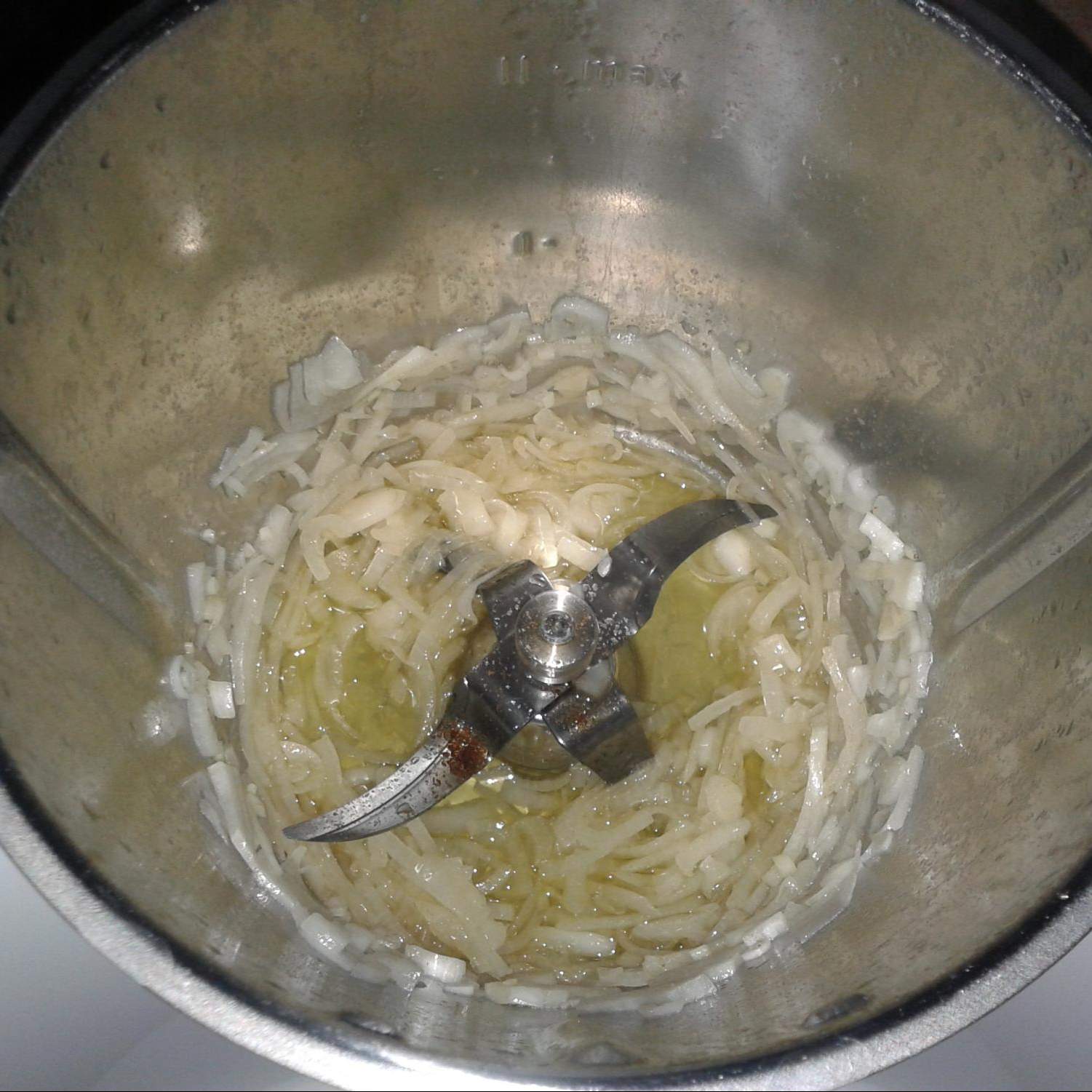 Mettere nel boccale cipolla, olio e peperoncino, rosolare 3 minuti, 100° vel soft.