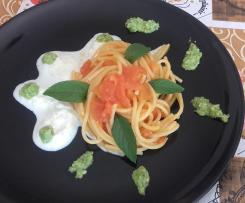 Stendere la crema di burrata sul fondo del piatto e, aggiungere qua e la il pesto a cucchiaiate, infine adagiare sopra la pasta e servire subito in tavola!