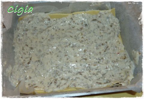 Comporre il pasticcio: foderare una teglia con carta forno, stendere 2 cucchiai di besciamella sul fondo, adagiare 1 sfoglia e ricoprire con besciamella e una spolverata di grana.