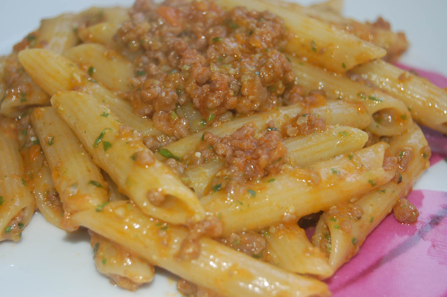 "velocità soft" . Cuocere la pasta al dente in abbondante acqua salata. Travasare il ragù in una capace pentola e scolarvi la pasta una volta cotta. Saltare un po' la pasta, amalgamando bene il ragù e aggiungere infine il pesto precedentemente messo da parte. Mantecare ancora un po' sul fuoco e servire subito.
