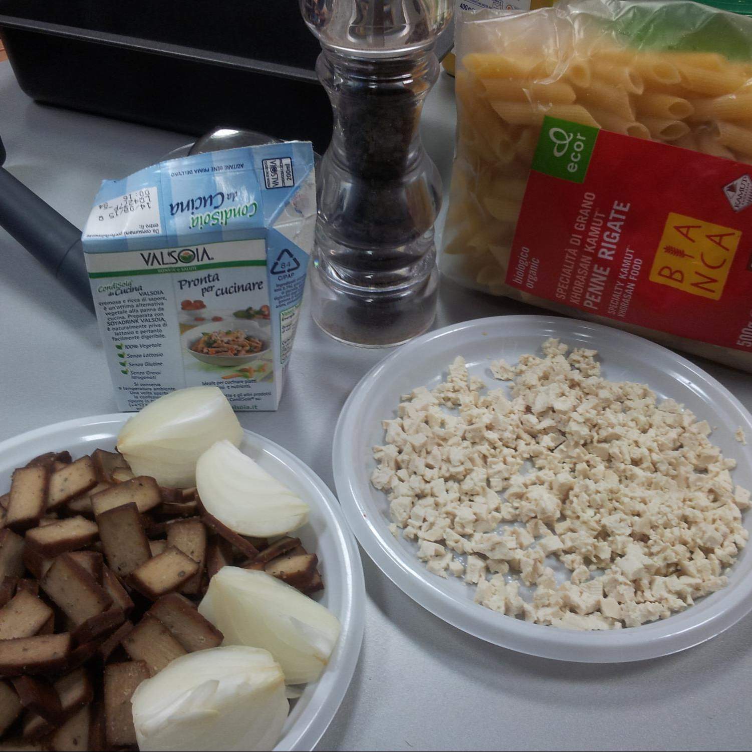 Ho usato penne di riso e granulare di soia reidratato in brodo, aggiungendo peperoncino in polvere al passaggio 3 e abbondante pepe alla fine per compensare un po' l'assenza di affumicatura.