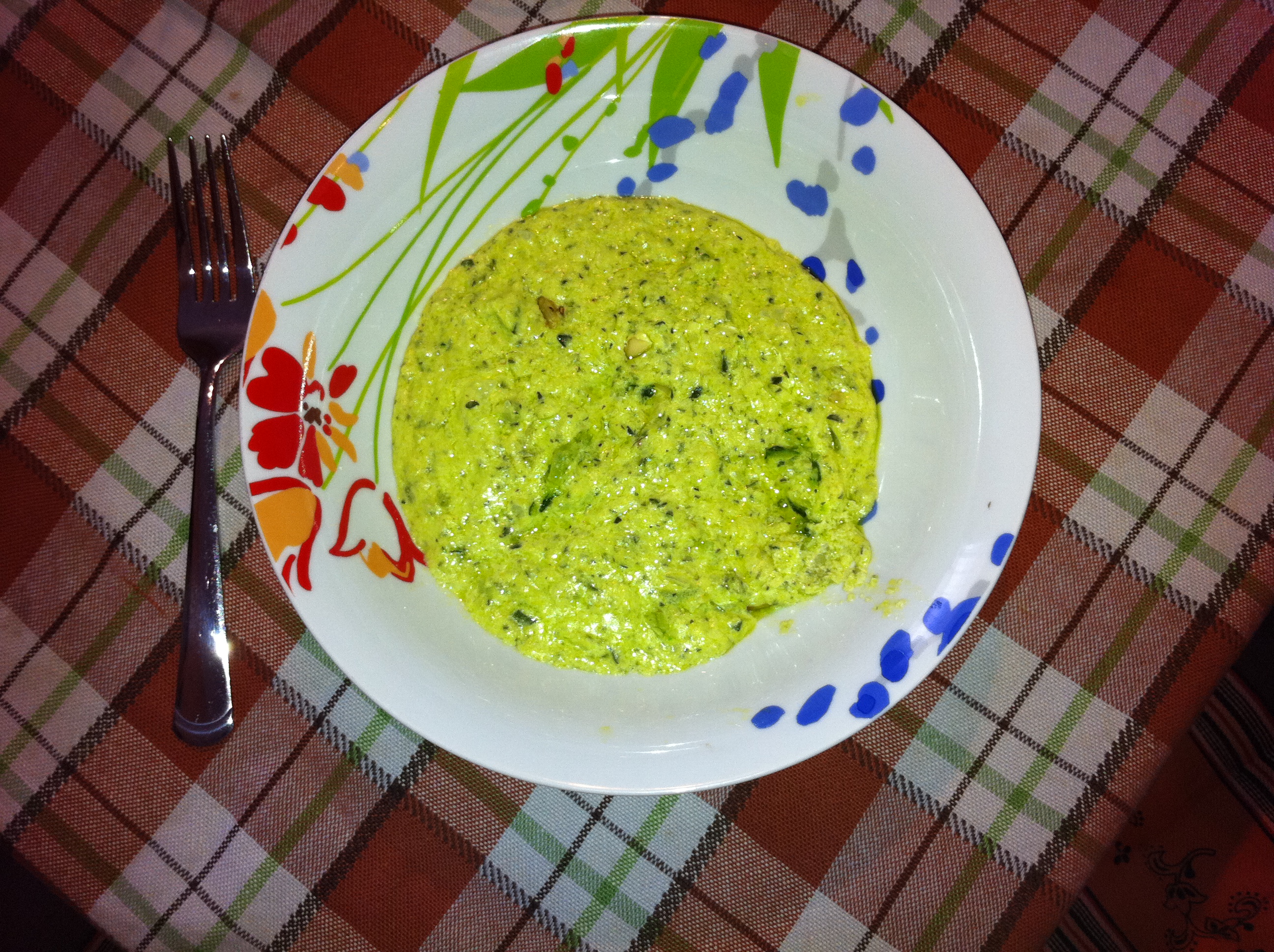 Bella ricetta...mi ispira molto volevo solo sapere se le zicchine vengono tritate bene così mio figlio pensa che sia pesto lui non ama le zucchine