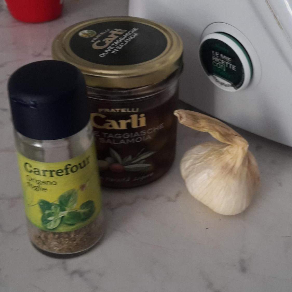 1. Gli ingredienti (a cui va aggiunto il pomodoro). Tritare lo spicchio d'aglio nel