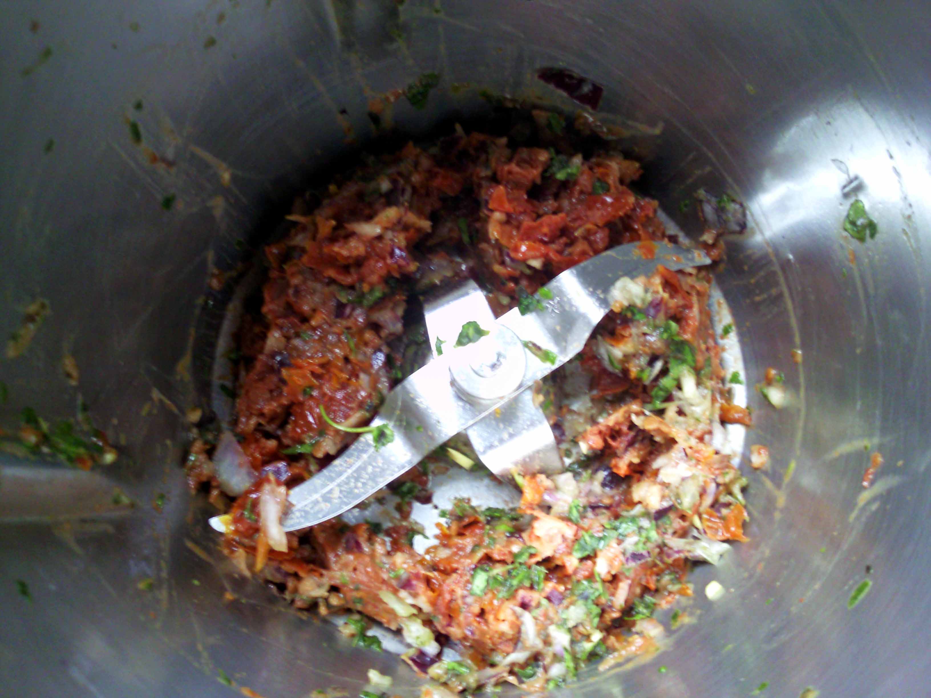 - Senza lavare il boccale, tritare cipolla, scalogno e pomodori secchi: 5'' vel 5.