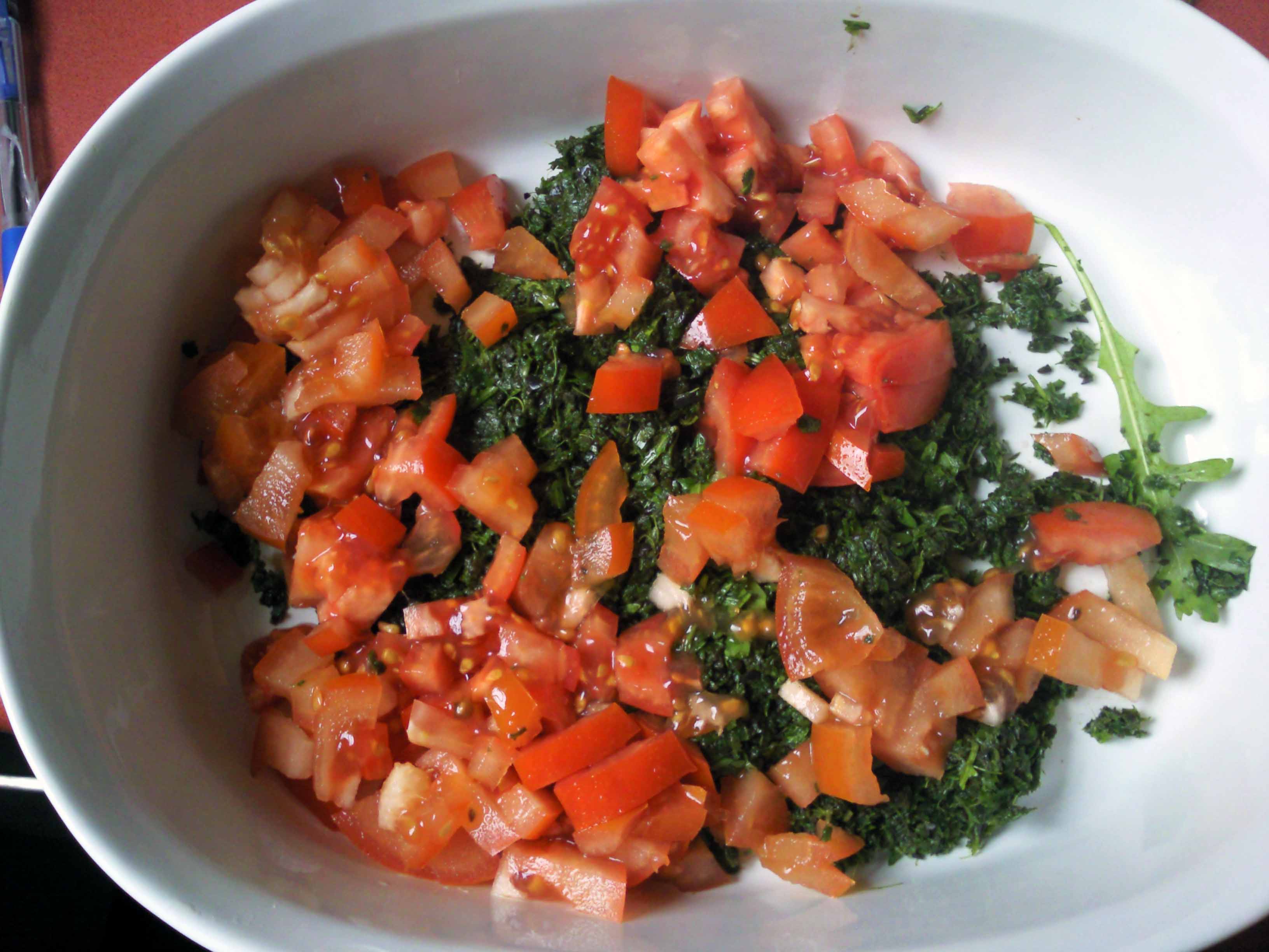 - Intanto tagliate a cubetti i pomodori e metteteli con la rucola nella risottiera.