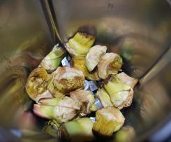 - Pulire i carciofi in modo da ottenerne circa 400 grammi e tagliarli in quarti.