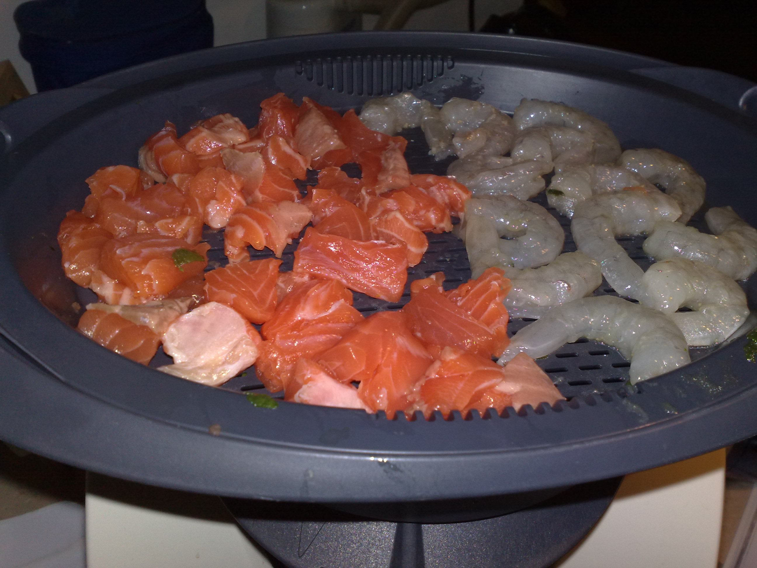"velocità spiga" . Lasciar riposare la pasta coperta per 30 min.PREPARARE IL RIPIENO: sgusciare i gamberi ie privarli del filo nero, lavarli velocemente in acqua e sale e sistemarli nel vassoio del Varoma . Togliere la pelle del salmone e le spine grosse, tagliare a pezzetti e posizionare nel vassoio del Varoma. sbucciare le patate e tagliarle a tocchetti, sistemarle nel recipiente del Varoma.- tritare il prezzemolo: 5 sec vel 7 e mettere da parte- versare l'acqua con il sale grosso, posizionare il Varoma con le patate (senza vassoio) e cuocere: 15 min temp. Varoma vel 1- aprire il coperchio del Varoma e posizionare il vassoio con i gamberi e il salmone e continuare la cottura: 5 min temp Varoma vel 1Nel
