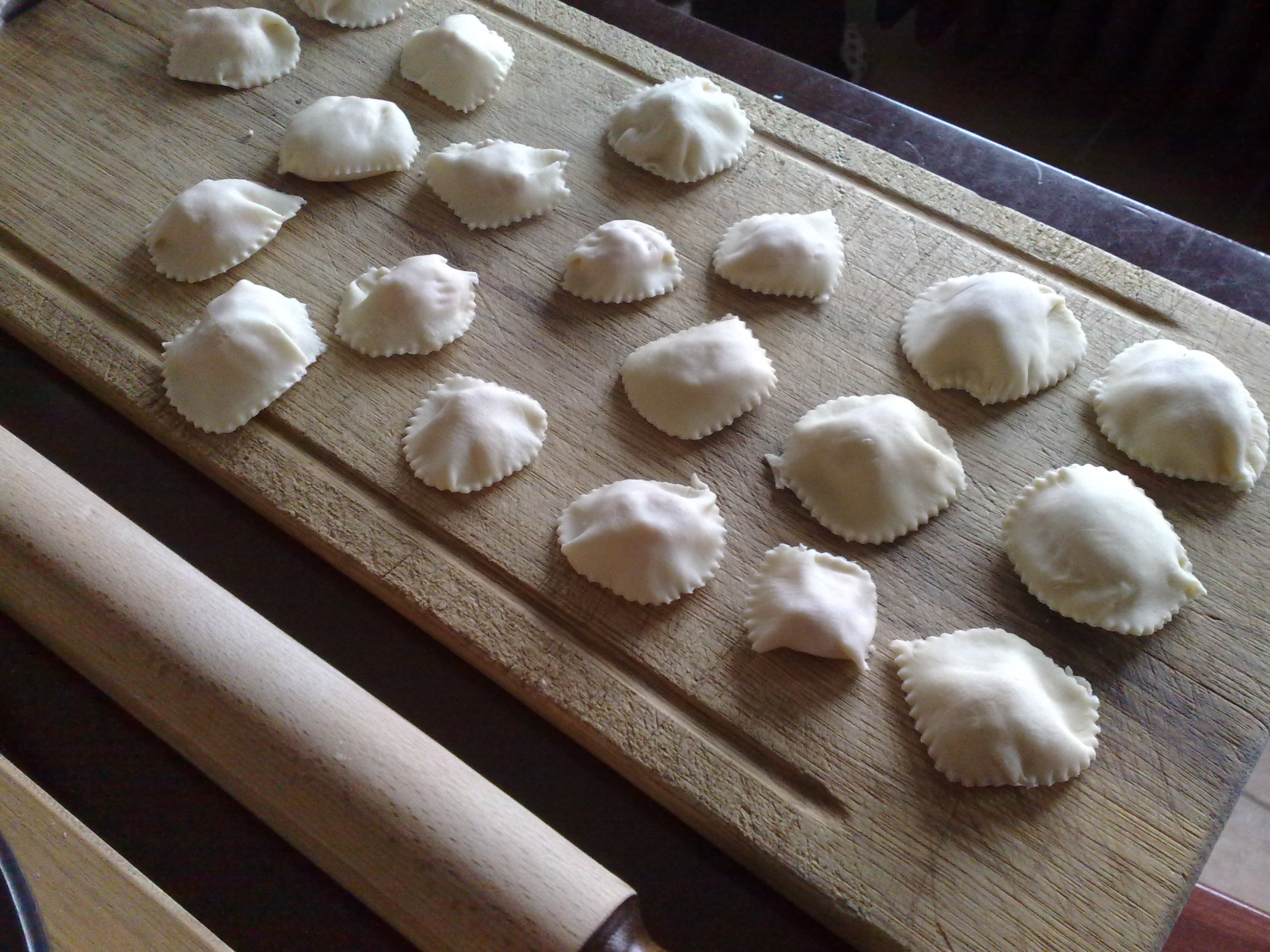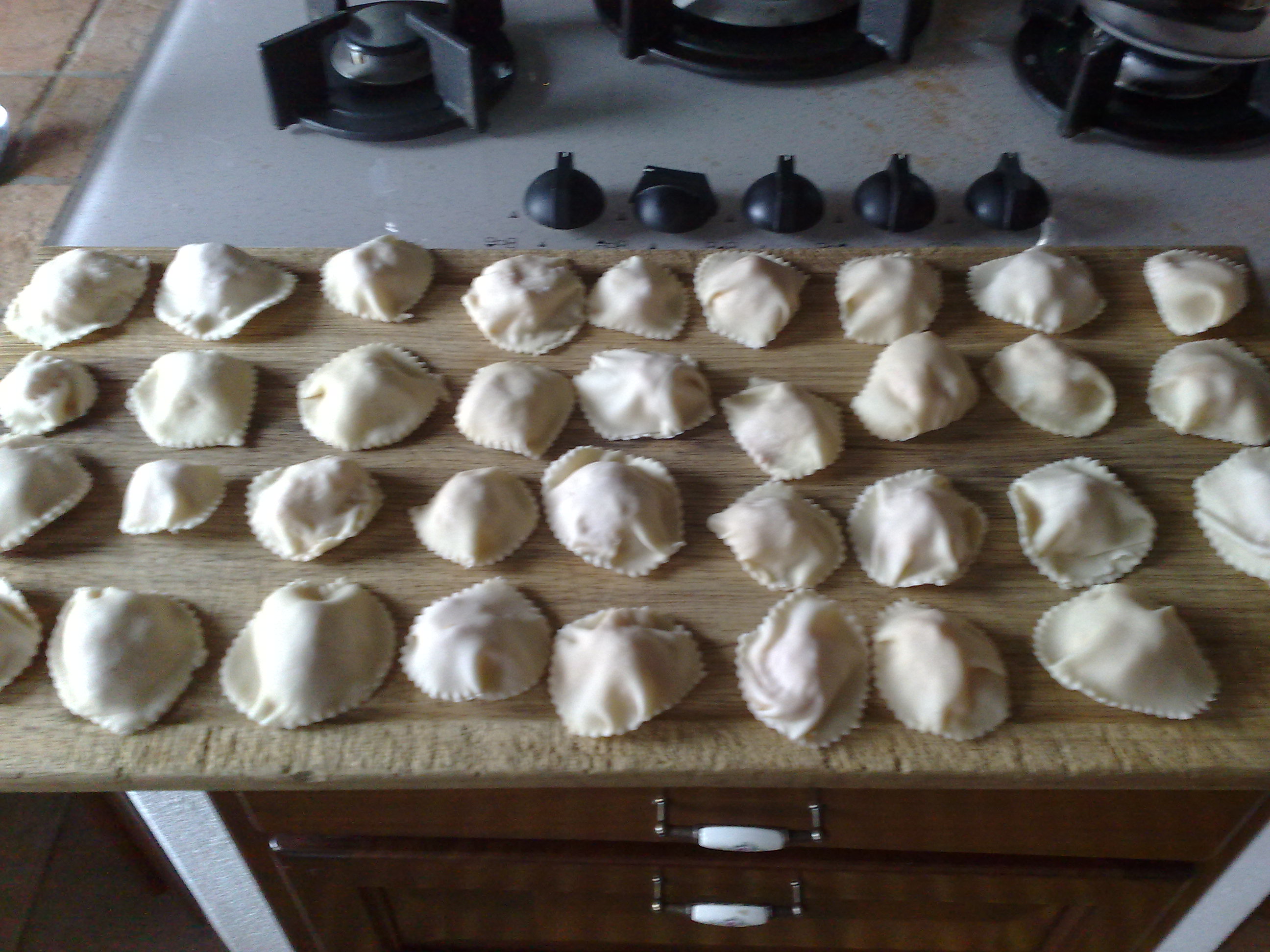 "coperchio chiuso" pulito versare le patate calde e frullare: 10 sec vel 4Unire i gamberi e il salmone, il prezzemolo e il sale, amalgamare 20 sec. vel 4. Lasciare riposare il composto 10 minuti.PREPARARE I RAVIOLI: dividere il panetto di pasta in più parti e da ogni pezzo ottenere una sfoglia sottile, distribuire su una striscia di pasta del ripieno, distanziato di circa 4 o 5 cm, ricoprire con un'altra striscia di pasta, premere con le dita tutt'intorno al ripieno per far uscire l'aria, infine, tagliare il raviolo della forma desiderata. Io li ho conditi con una cremina a base di ricotta (per non usare panna da cucina) ma anche con un filo di olio, aglio e prezzemolo secondo me sono ottimi!
