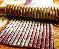 - Taglia le singole sfoglie con l'apposito matterello zigrinato tagliapasta sul piano di lavoro ben infarinato (se non avete il matterello potete tagliare le sfoglie con l'accessorio per le tagliatelle della sfogliatrice);
