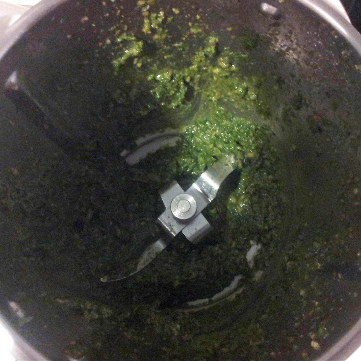 "coperchio chiuso" le foglie di basilico, i pomodorini secchi, l'aglio, i pinoli e tritare per 20 secondi a velocità 7. - Aggiungere l'olio e il sale ed emulsionare per 20 secondi a velocità 4. Mettere da parte.