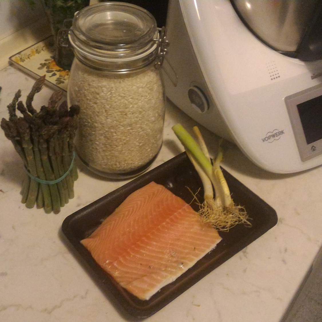 1. Gli ingredienti. Pulire il salmone (togliere pelle e spine) e tagliarlo a dadolini. Tagliare l'asparagina a pezzetti. Pulire i cipollotti e metterli nel