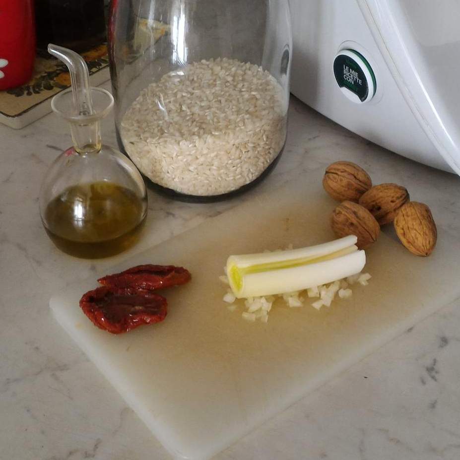 "antiorario" . Ad 1 minuto dalla fine aggiungere il burro a mantecare. Servire il risotto spolverizzando con le noci tritate.