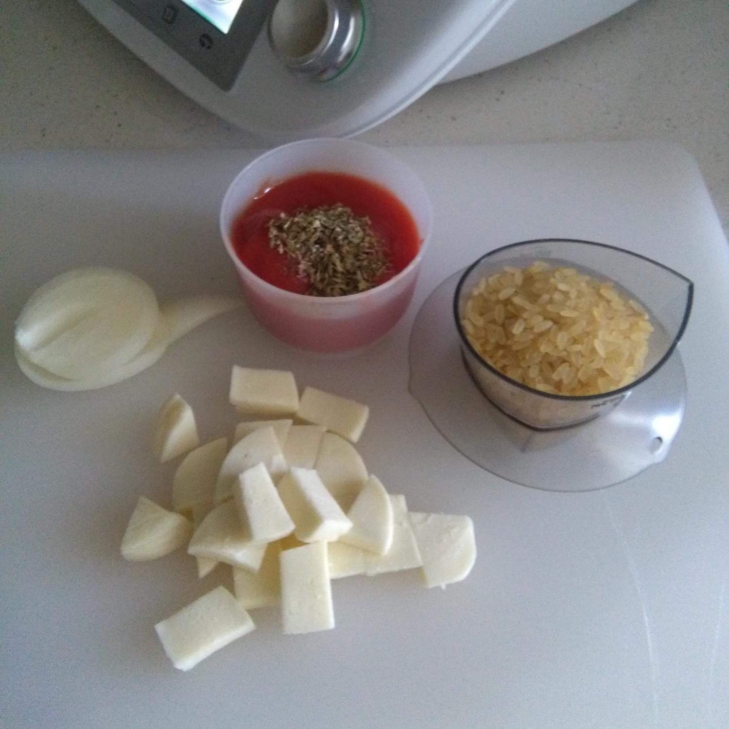 Versare il riso in una pirofila da forno, guarnire con la mozzarella e il pomodoro tenuto da parte tagliato a pezzi e cuocere in forno a 180° per qualche minuto (il tempo necessario che la mozzarella si sciolga) eventualmente utilizzando la funzione grill.