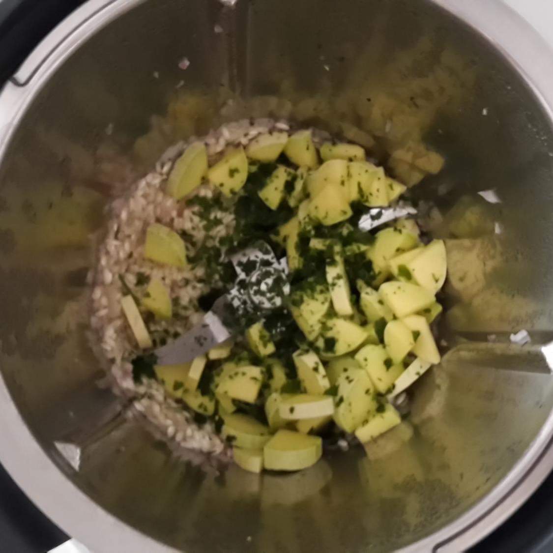 2. Aggiungere le zucchine tagliate a tocchetti, il prezzemolo, l'acqua e il dado Bimby. Cuocere per 13 minuti a 100°