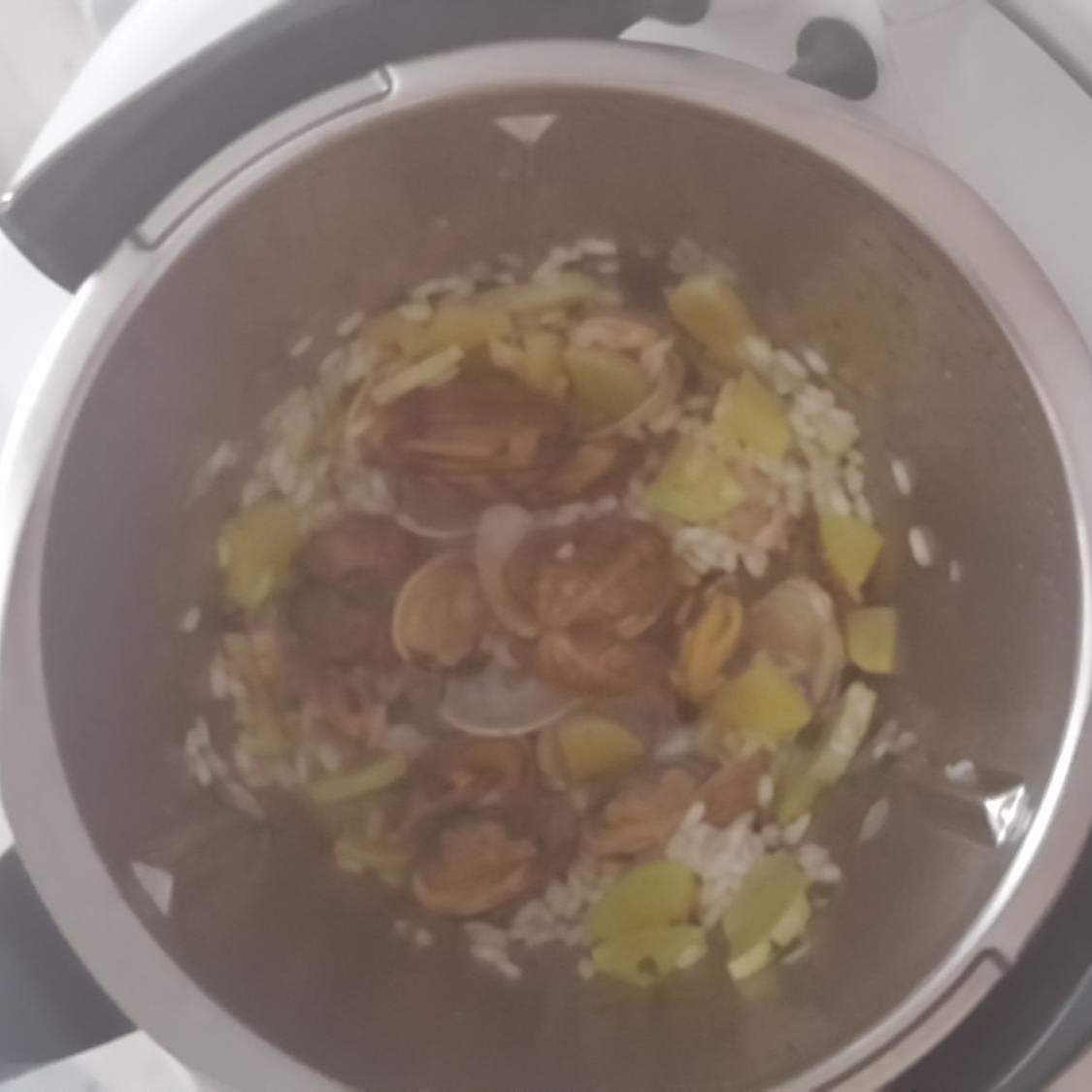 "velocità soft" . A 5 minuti dalla fine versare le vongole dal foro del coperchio (metà con il guscio e metà senza). A 2 minuti dalla fine aggiungere il burro a mantecare.