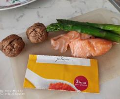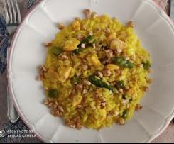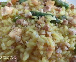 Risotto allo zafferano e prosecco con salmone fresco, asparagi e granella di noci