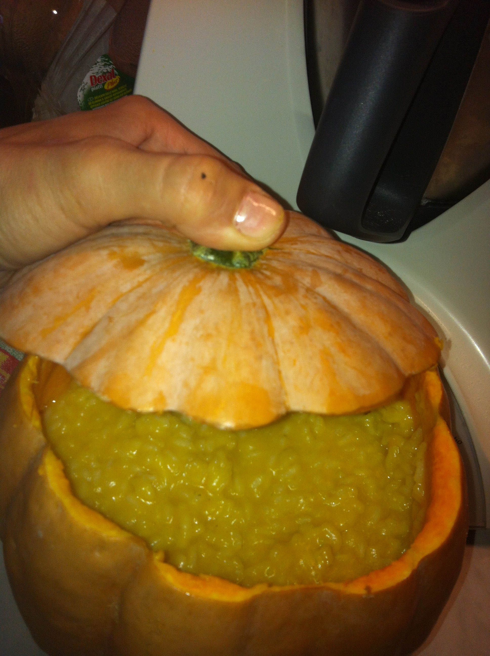 "antiorario" vel 1 spatolandoVersare il riso all'interno della zucca vuota e servire.