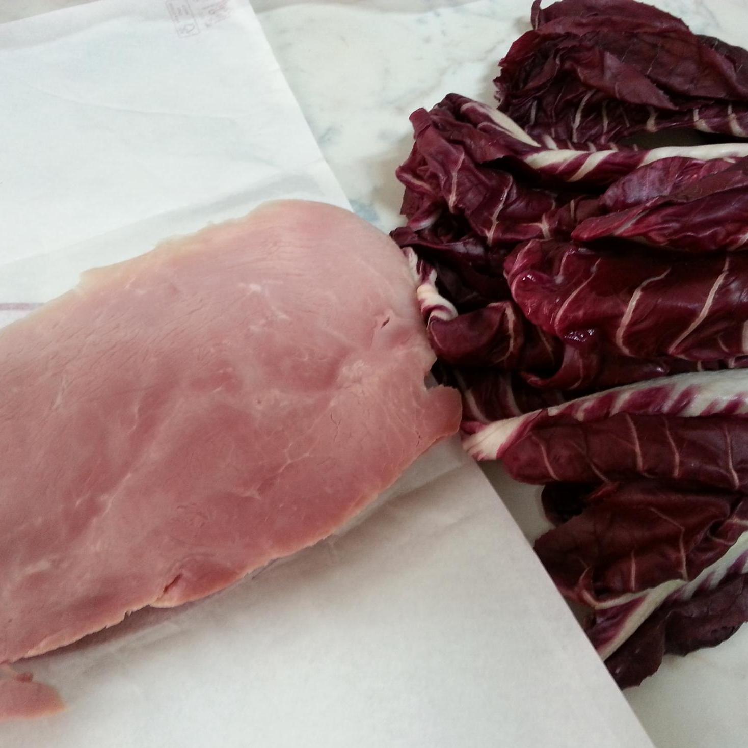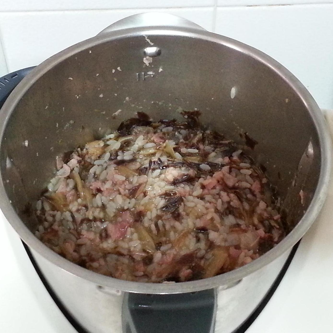 Tritare la cipolla, il radicchio e il prosciutto 10 sec. vel.4, unire l'olio e cuocere 2 min. 100° vel.