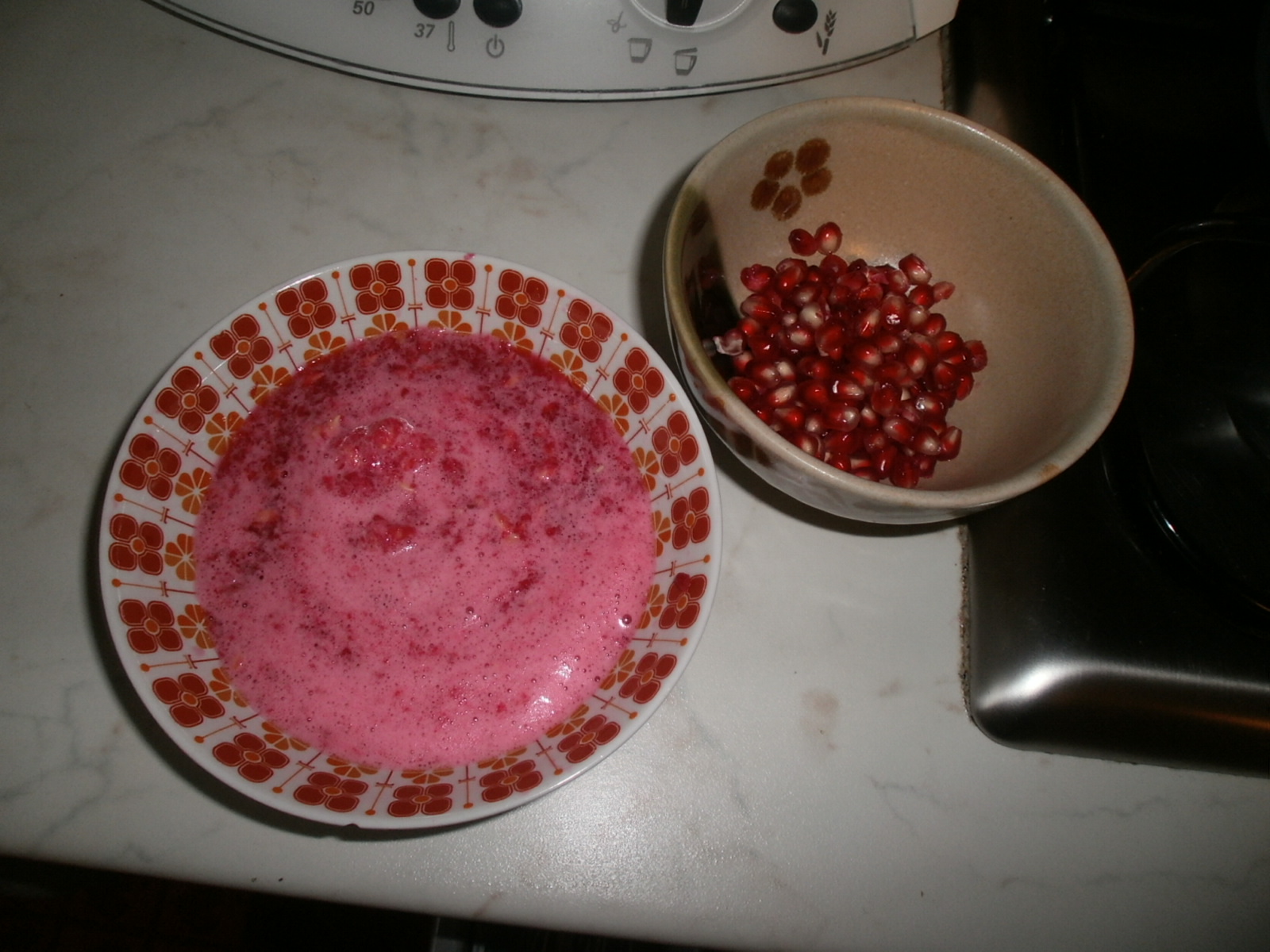 Pulite e sgranate la melagrana. Tenetene 2 cucchiai per decorare e il resto frullatelo 15 sec. vel.5