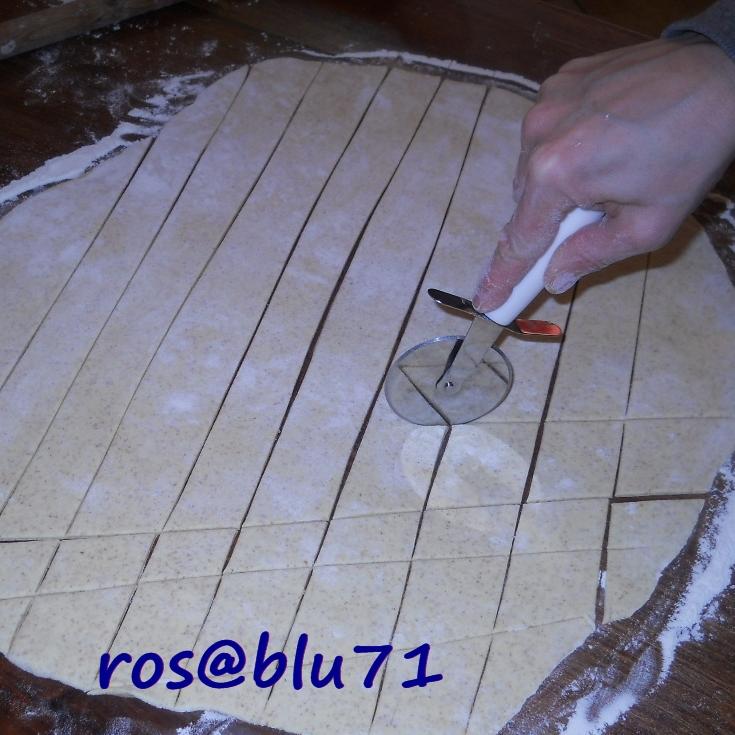 5. Quando sara' trascorso il tempo neccessario per la pasta riprenderla e con aiuto di un po' di farina e mattarello tirate una sfoglia dello spessore di 1 /2 MM tagliate delle strisce e fate dei rombi