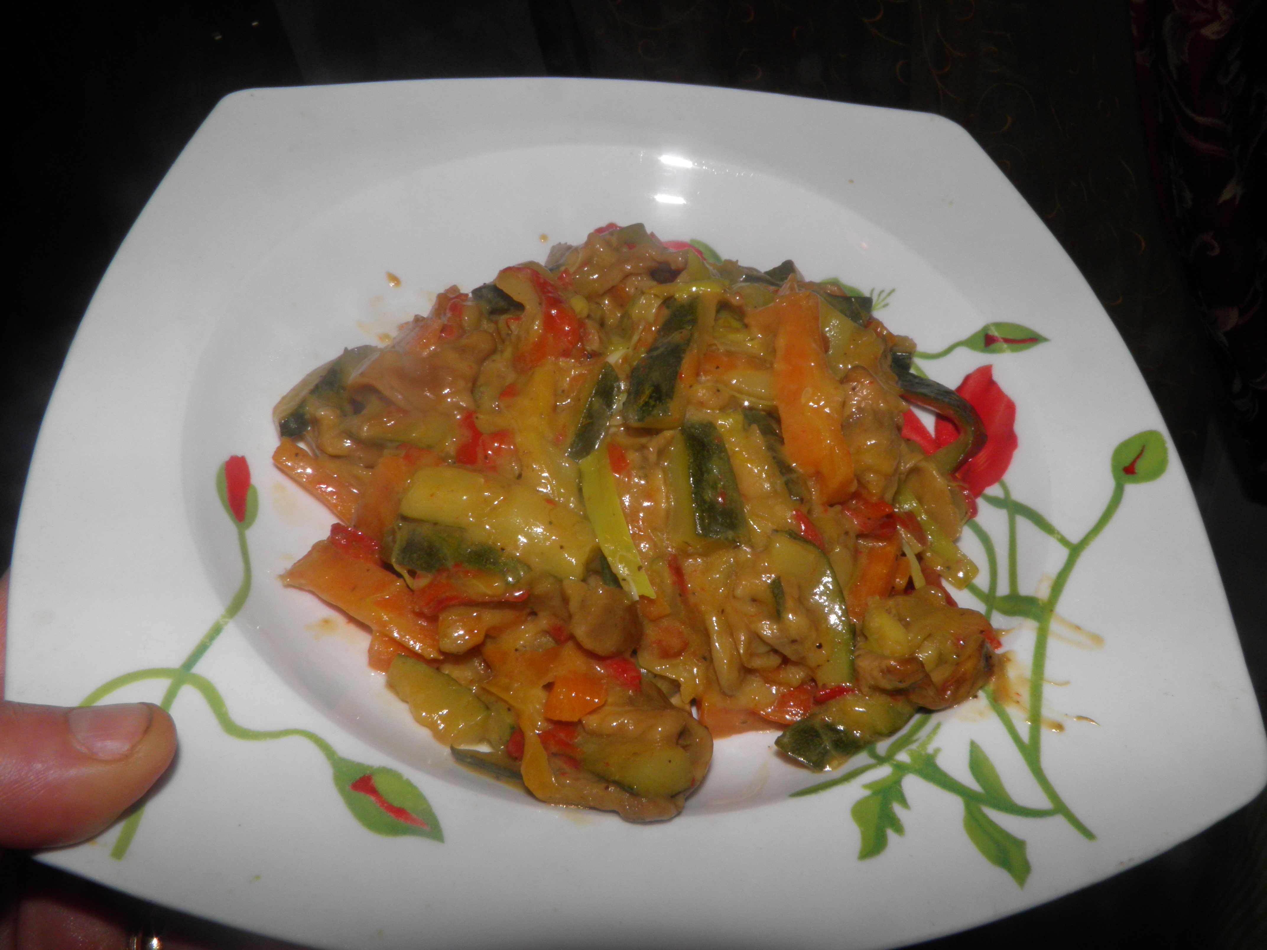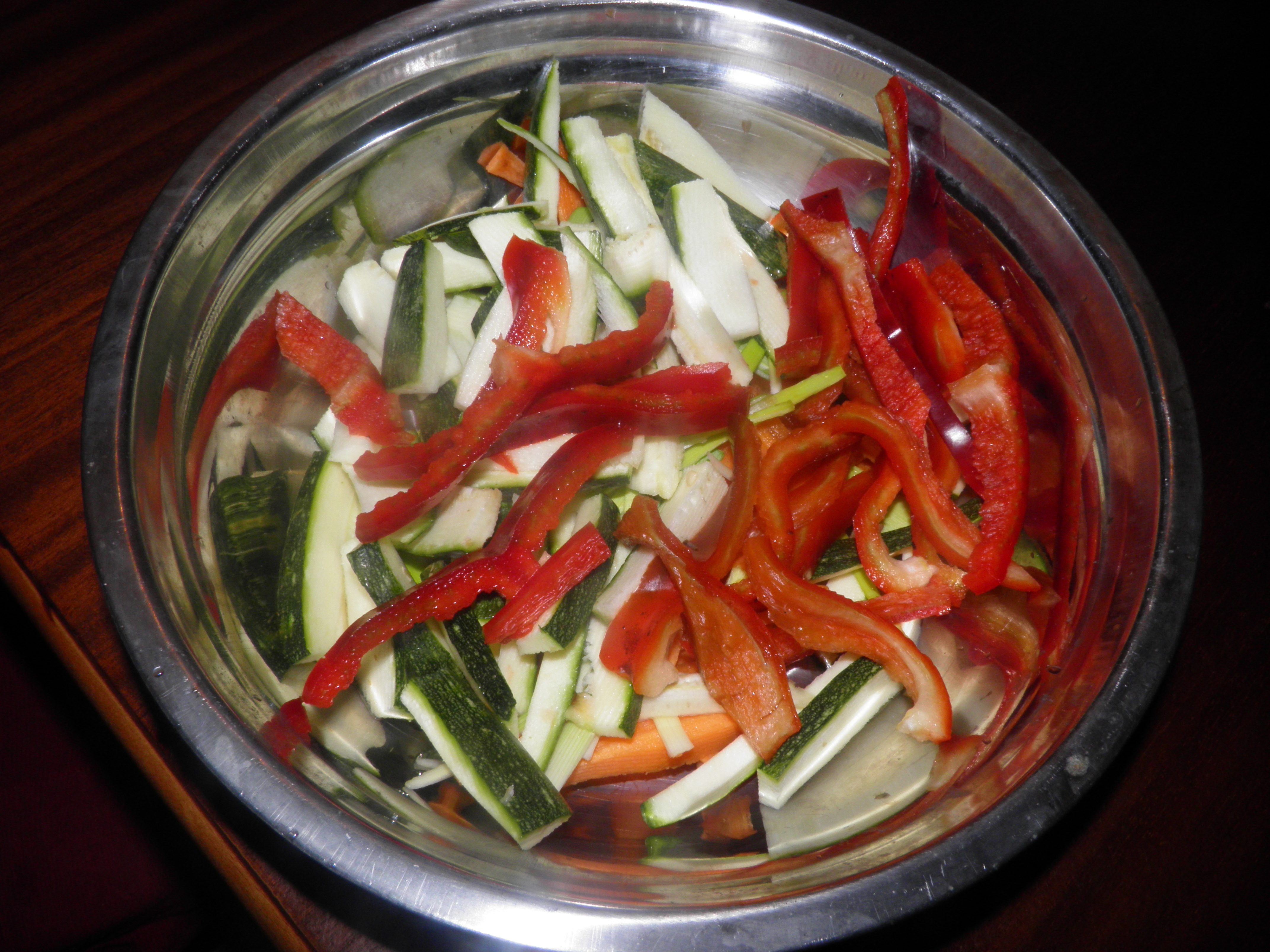 Lavare e tagliare le verdure a julienne, nel frattempo mettere a mollo con acqua i funghi secchi ( 15 min sono sufficienti) Nel boccale mettere l'olio, poi le verdure, i funghi e aggiungere il vino, il sale e il pepe e infine nel cestello mettere i gamberetti, e cuocere 15 min. 100°