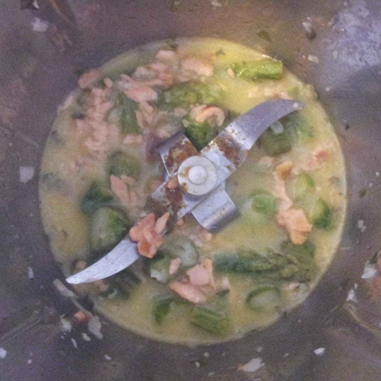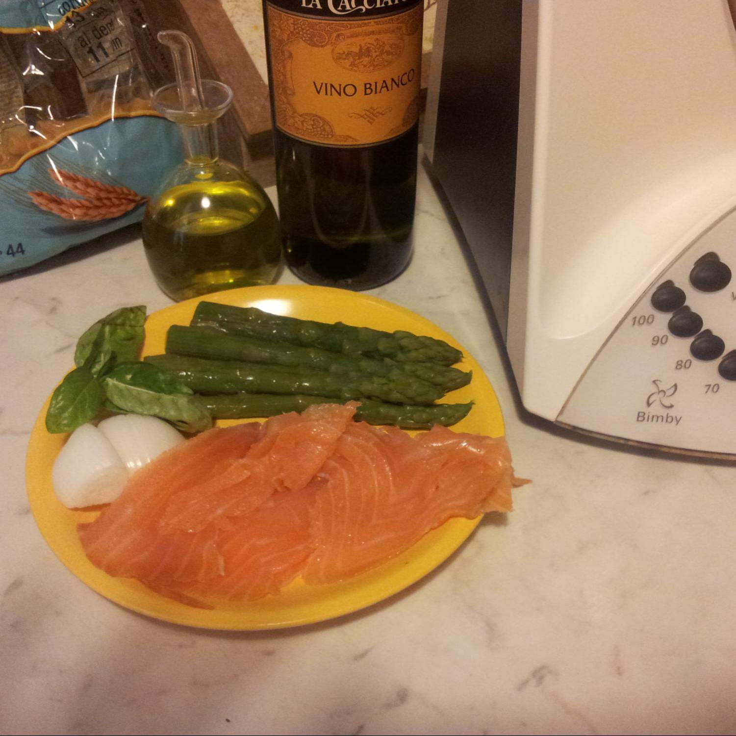 1. 1. Cuocere gli asparagi nel Varoma per 15 minuti. 2. Mettere il salmone nel coperchio chiuso"coperchio chiuso" e tritarlo per 20 secondi a velocità 5, mettere da parte. 3. Mettere la cipolla e il basilico nel coperchio chiuso"coperchio chiuso" , tritare per 10 sec a vel 5. Aggiungere l'olio e soffriggere per 3 minuti a 100° velocità soft"velocità soft" . 4. Mettere nel coperchio chiuso"coperchio chiuso" il salmone tritato e il vino, sfumare per 5 minuti 100° velocità soft"velocità soft" antiorario"antiorario" . 5. Aggiungere gli asparagi tagliati a pezzi e cuocere per 3 minuti a 100° velocità soft"velocità soft" antiorario"antiorario" , regolare con sale e pepe. 6. Condire la pasta con il sugo ottenuto.