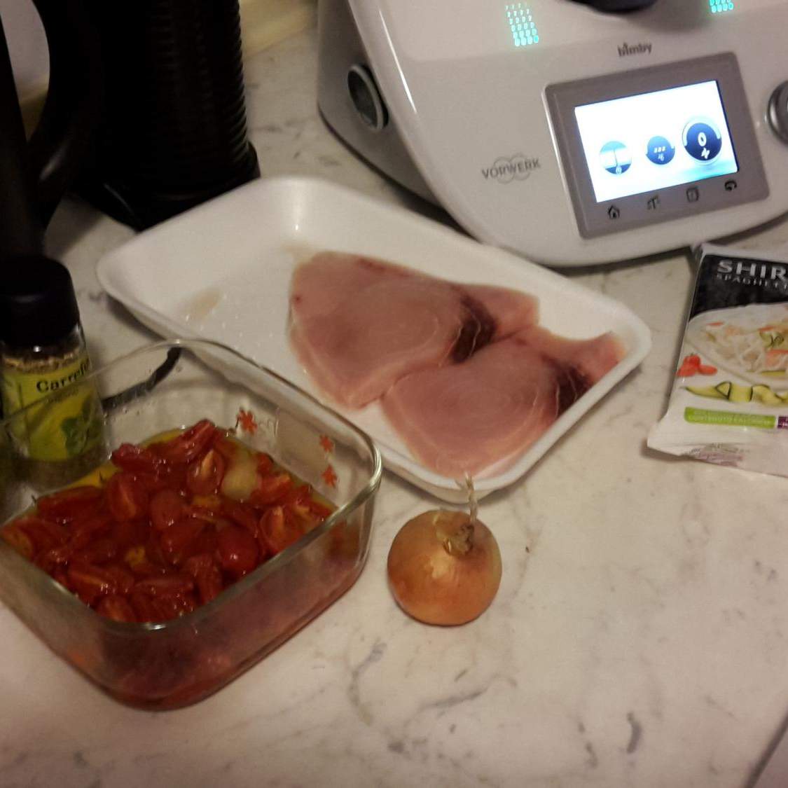 Gli shirataki sono un tipo di pasta di origine giapponese priva di glutine. Somigliano un po' agli spaghetti di soia. I pomodorini confit si ottengono facendo seccare in forno per 2 ore a 100° dei pomodorini datterini privati della buccia e condendoli con un filo d'olio e del timo.