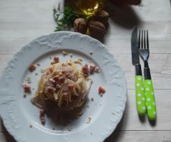 Spaghetti con cipolle rosse pancetta affumicata e granelle di noci a modo mio