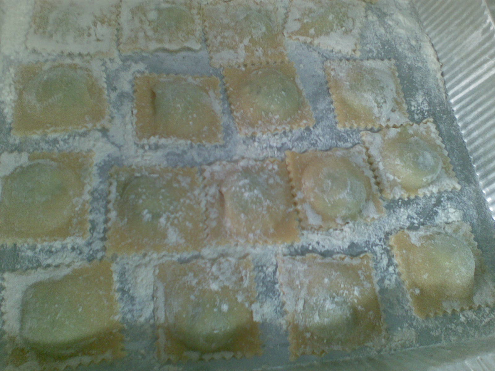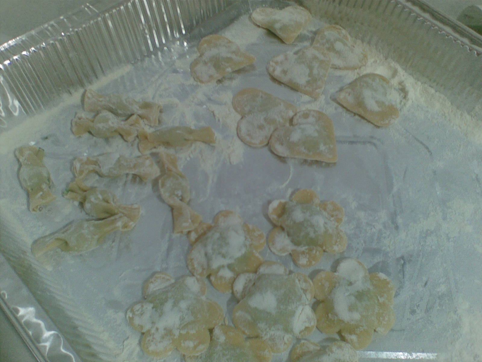 Mettere nello stampo dei tortelli una sfoglia e con una sacca a poche (o con un cucchiaino) inserire un po’ di ripieno al centro di ogni tortello. Richiudere mettendo sopra un’altra sfoglia e passare sopra il mattarello.