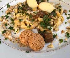 "coperchio chiuso" sporco mettere la scamorza e tritare 5 sec vel 7.Aggiungere il latte il burro la farina il sale e il pepe cuocere 9 min 90° vel 4. - Calare la pasta nella pentola con l'acqua aggiungendo un filo d'olio per non farla attaccare cuocere pochi minuti (circa 4min) e scolare.Condire la pasta con meta` della besciamella di scamorza e metà del sugo di funghi, disporre su un piatto da portata e irrorare con la restante besciamella e sugo di funghi, spolverizzate con il prezzemolo tritato le noci e gli amaretti sbriciolati.Buon Appetito 🥰