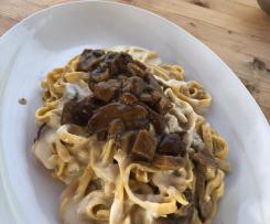 "velocità spiga" .Uscire l'impasto dal boccale e con l'apposita macchinetta tirare la sfoglia e aiutandosi con un po di farina successivamente passare la sfoglia nella trafila per tagliatelle.Tenere le tagliatelle fino al momento della cottura su un vassoio infarinato per non farle attaccare.Nel frattempo portare a bollore l'acqua salata una pentola bel capiente . - SUGO AI FUNGHI:Mettere nel
