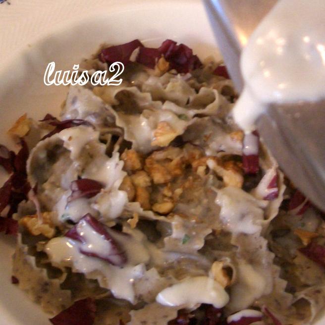 Consiglio di condirle come nella foto, solo un piatto alla volta se si è solo in due, in caso contrario cioè più persone, scolare le tagliatelle al dente, metterle in una padella, unire metà dose della fonduta e un pò di acqua di cottura, mescolarle bene, impiattarle e decorarle con le noci e la trevisana. A parte portare in tavola la restante fonduta calda