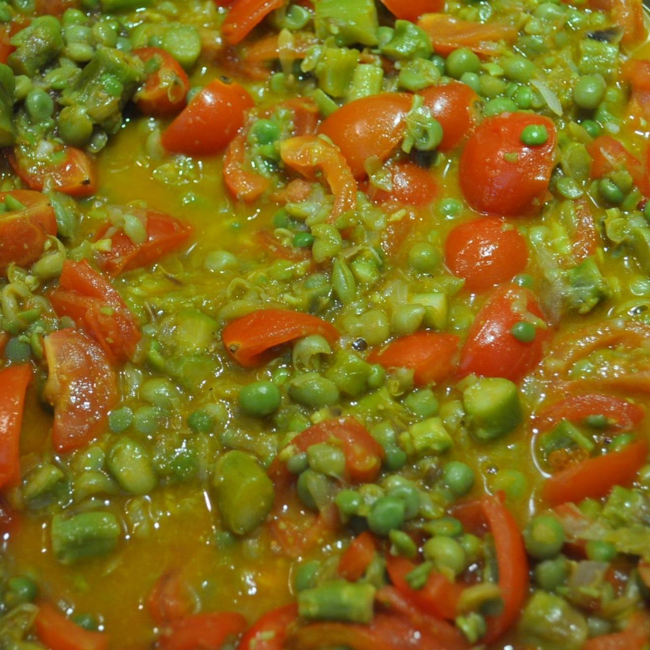 "coperchio chiuso" la cipolla e tritarla, 4 sec. Vel.7, riunire sul fondo. Aggiungere l’olio e l’aglio e far rosolare 3 min. 100° Vel. 1 - Aggiungere i piselli sgranati e lavati e le punte d’asparagi anch’esse lavate, una macinata di pepe bianco, la presa di sale e cuocere a 100° vel. Soft