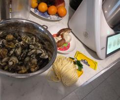 Unire le vongole veraci e il vino bianco. Sfumare e far aprire le vongole 3 min 120°
