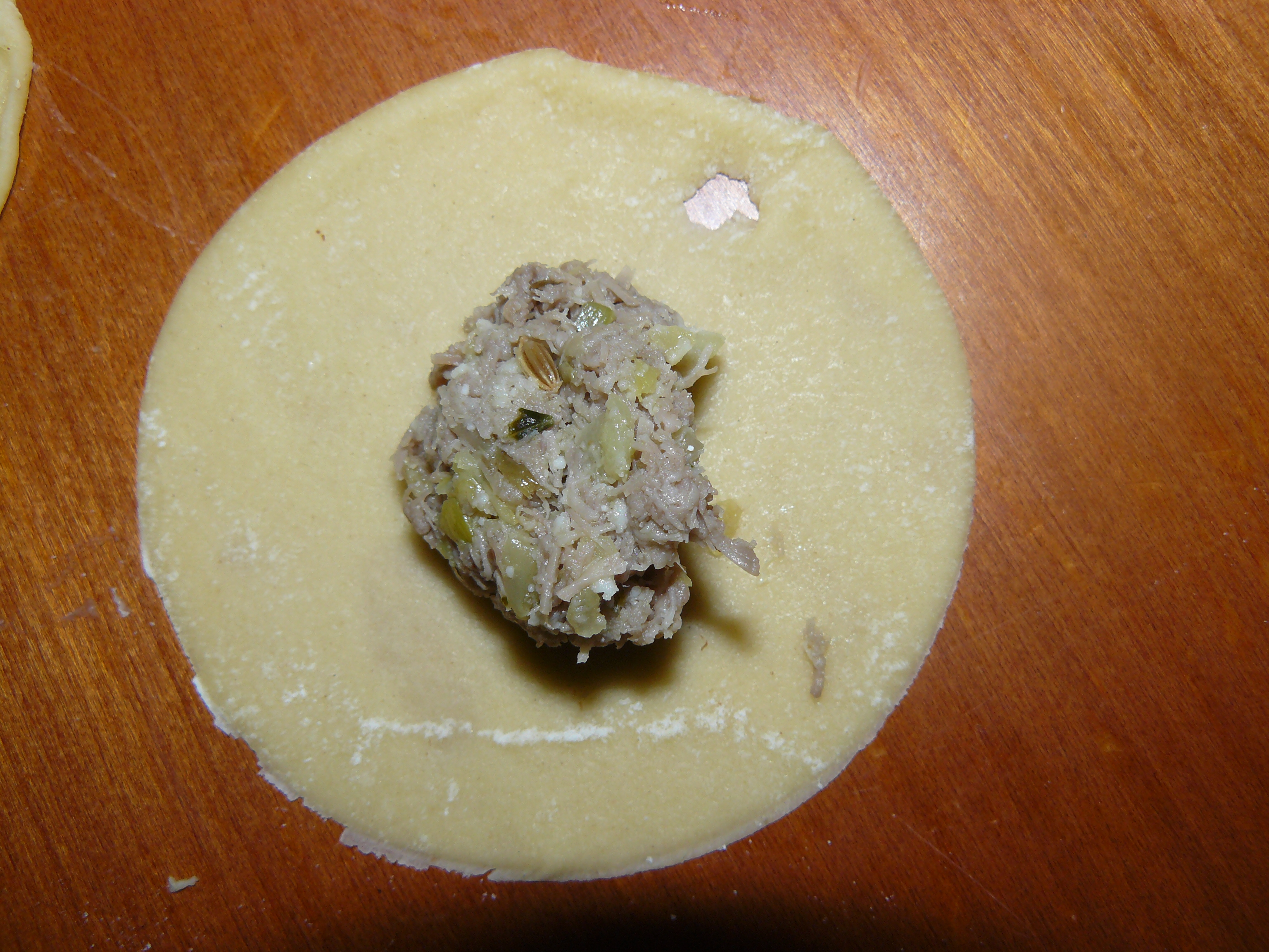 Stendere la pasta molto sottilmente. Con un bicchiereo un coppapasta fare dei cerchi. Versare una pallina di ripieno