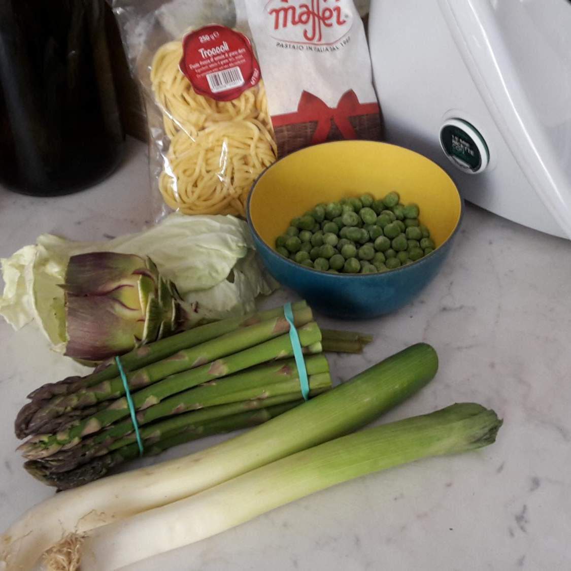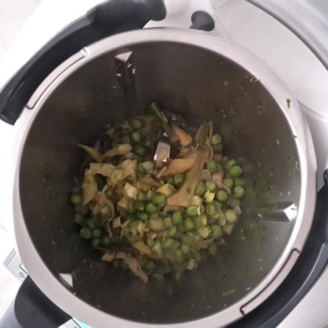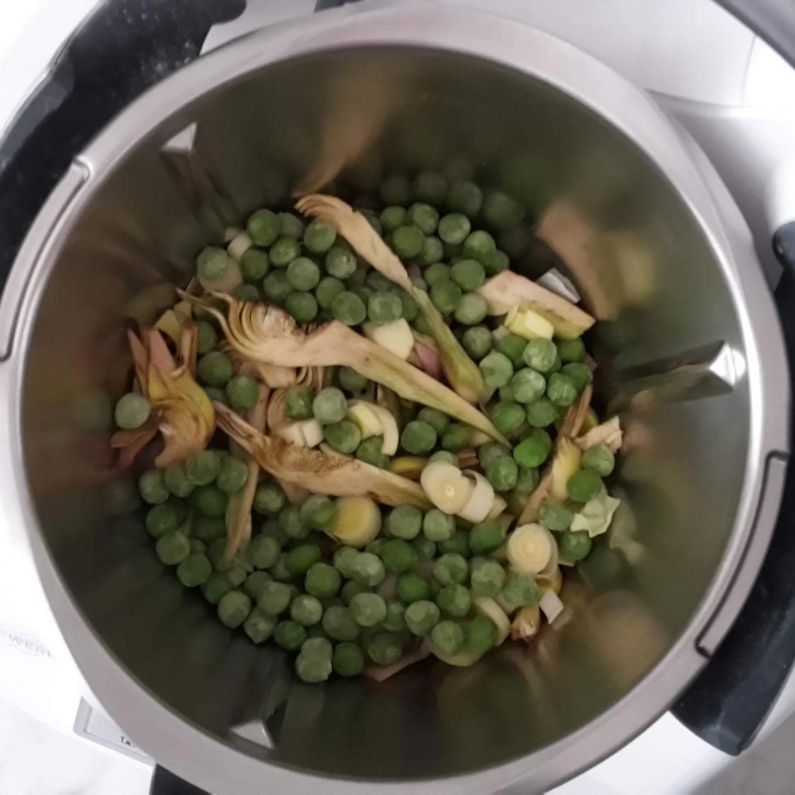 2. 2. Versare l'olio nel coperchio chiuso"coperchio chiuso" . Pulire e tagliare a fettine gli asparagi, i carciofi, i porri e la lattuga e inserirle nel coperchio chiuso"coperchio chiuso" insieme ai piselli. Soffriggere per 3 min 120° velocità soft"velocità soft" antiorario"antiorario" . Aggiungere l'acqua e il sale e cuocere per 15 min 100° velocità soft"velocità soft" antiorario"antiorario" . Nel frattempo cuocere la pasta in una pentola a parte.
