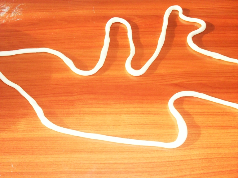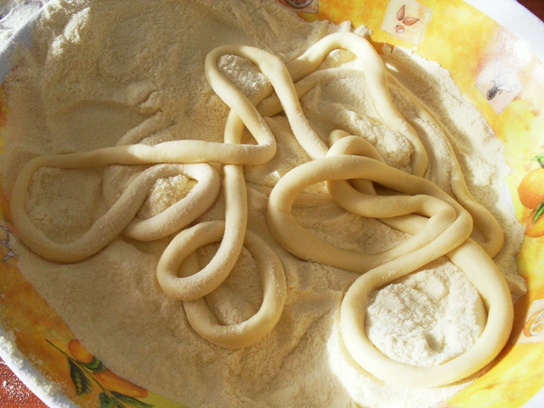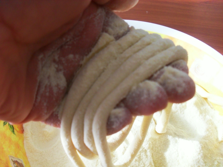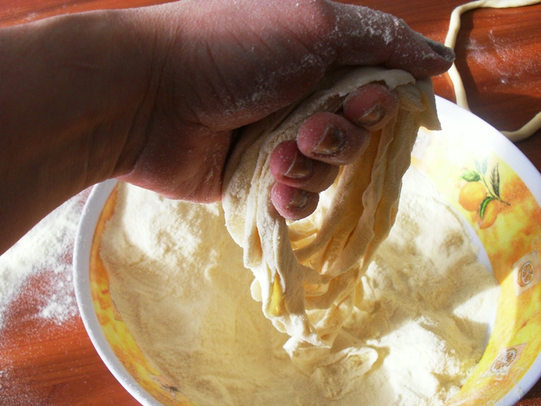 - Man mano che la corda si allunga avvolgere ancora sempre infarinando intorno alla mano e stringere finche non ha una consistenza tipo le tagliatelle;