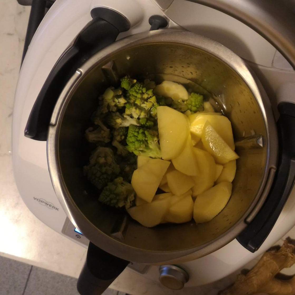 2. Aggiungere le patate, i broccoli, l'acqua e il sale e cuocere per 25 min 100° vel 0,5.