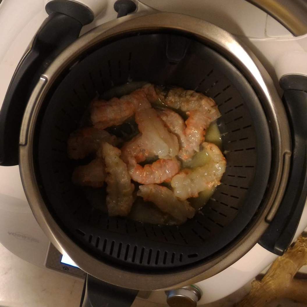 3. Aggiungere il cestello con le code di scampi e cuocere per altri 2 min 100° vel 0,5. Togliere il cestello con l'aiuto della spatola. Chiudere il