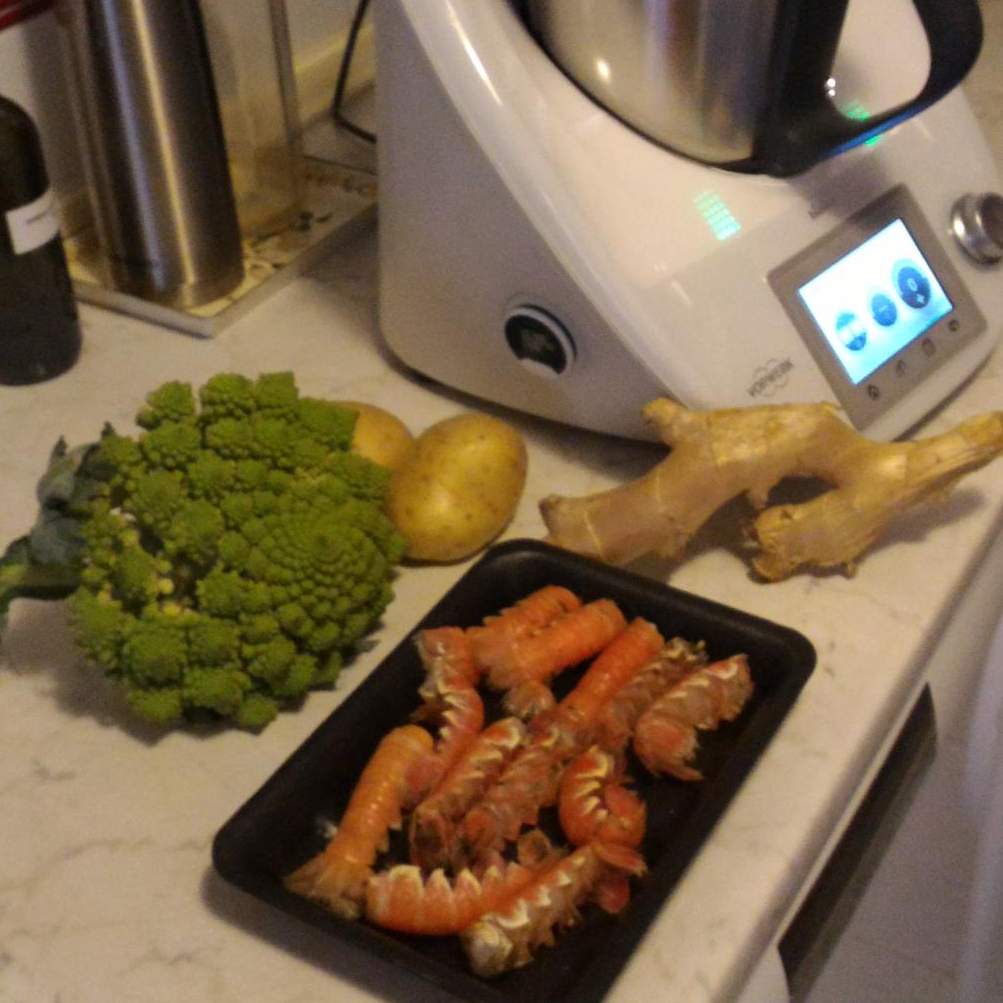 "coperchio chiuso" e omogenizzara per 20 sec vel 8. Versare la vellutata nei piatti fondi, posizionare 3 scampi per ogni piatto, macinare del pepe, grattuggiare dello zenzero fresco, un filo d'olio e mettere un po' di noci tritate.