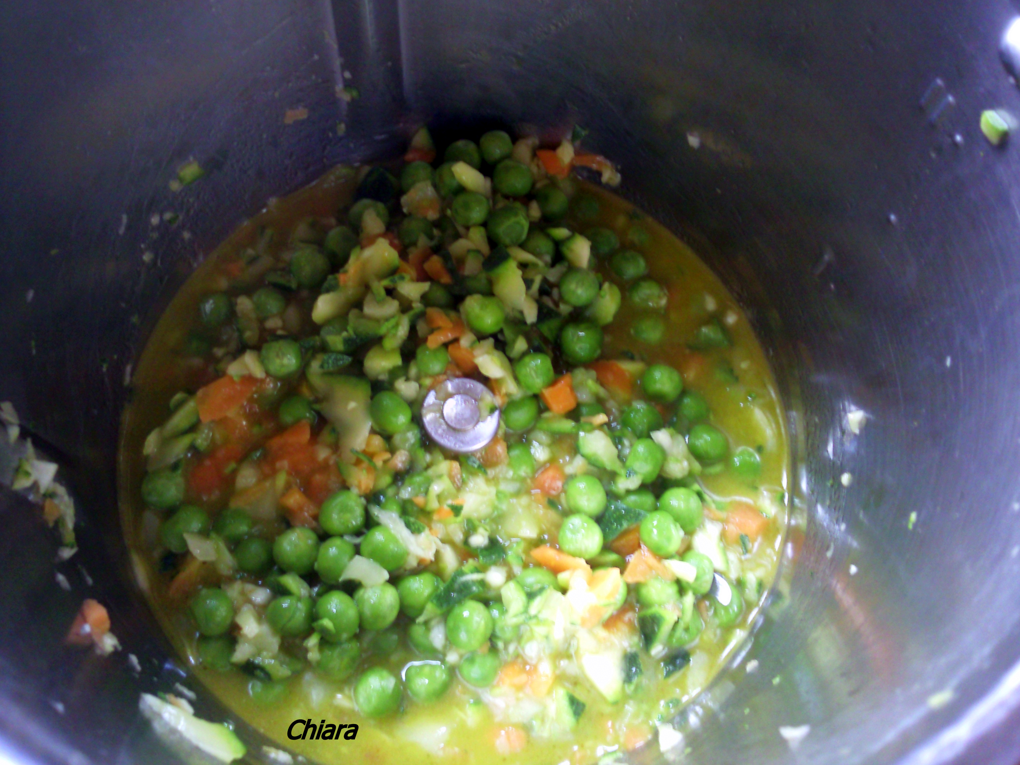 3. Aggiungere i piselli, il dado, l'olio e l'acqua e cuocere 10', 100° (no varoma per paura che le verdure si spappolino) vel 1 antiorario"antiorario" .