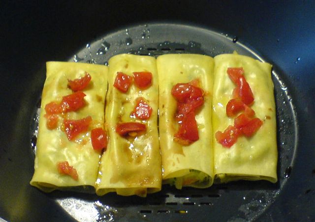 "antiorario" vel 4Mentre la verdura cuoce, ricavare dalla pasta 12 rettangoli, dividere tra essi le verdure e arrotolarli. Ungere leggermente il vassoio del varoma e adagiarvi i cannelloni