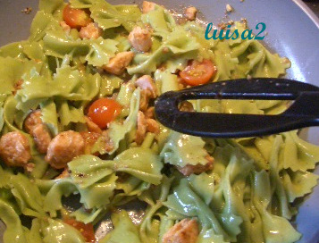 Lessare le farfalle per un minuto nell'acqua poi trasferirle nella padella contenente il sugo, mantecare con qualche cucchiaiata di acqua della pasta e finire la cottura (1 min ancora)