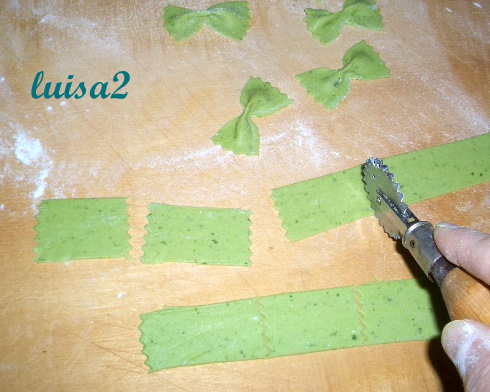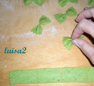 "coperchio chiuso" mettere 50 g di farina (presa dal totale) e le foglie di rucola ben asciutte, frullare 10 sec vel 6, unire tutti gli altri ingredienti: 20 sec vel 4 poi 2 min vel spiga, togliere e mettere nella pellicola a riposare per almeno 30 min.Con la macchinetta tirare una sfoglia alla volta, tagliarla a strisce di cm 2,5 per tutta la lunghezza e con la rotella tagliare ogni striscia in rettangolini di 4 cm, con le dita pizzicare a metà il pezzetto in modo da formare la farfalla, spolverizzare con la semola le farfalle pronte (per non farle attaccare tra loro)
