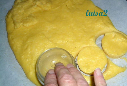 Quando la polentina e pronta, versarla sulla carta forno e stenderla con la spatola bagnata a circa 1 cm, lasciare raffreddare il composto. Con il misurino ritagliare i dischetti, rimpastare i ritagli e ritagliare anch essi. disporli in una teglia imburrata, cospargerli di parmigiano gratuggiato e fiocchetti di burro