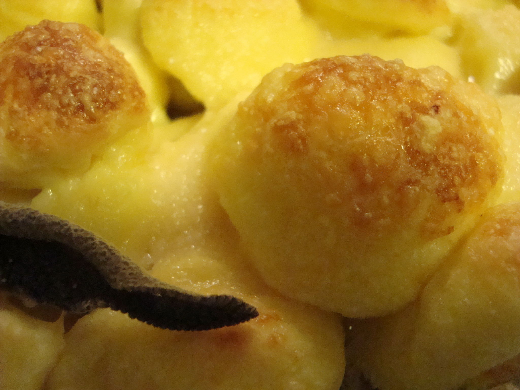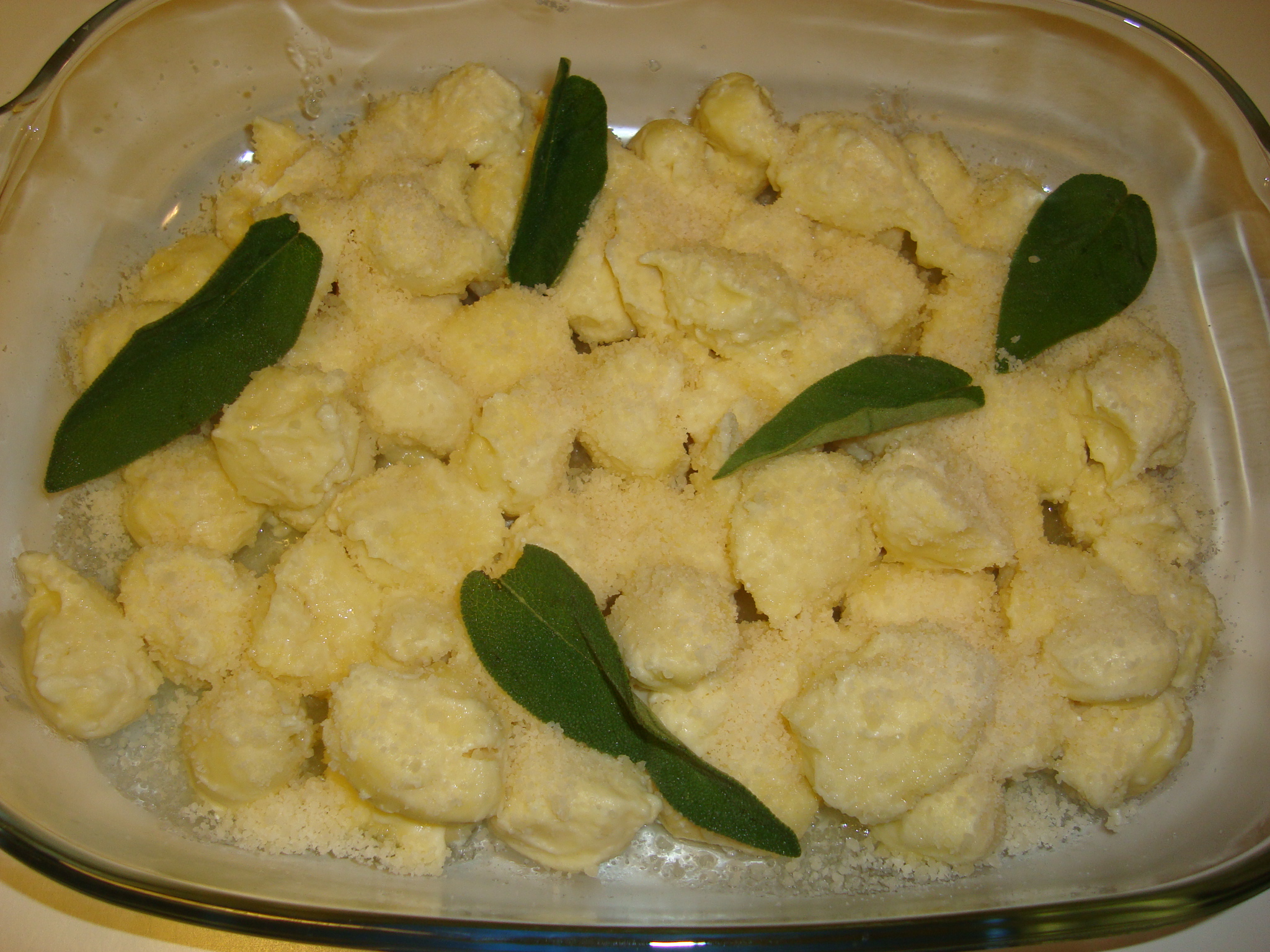 Mettere gli gnocchi in una pirofila imburrata , cospargere con burro fuso, tre quarti di parmigiano e foglie di salvia. Cuocere in forno caldo a 200° per 10 minuti, poi cospargere con il restante parmigiano e terminare la cottura sotto il grill per altri 5 minuti.