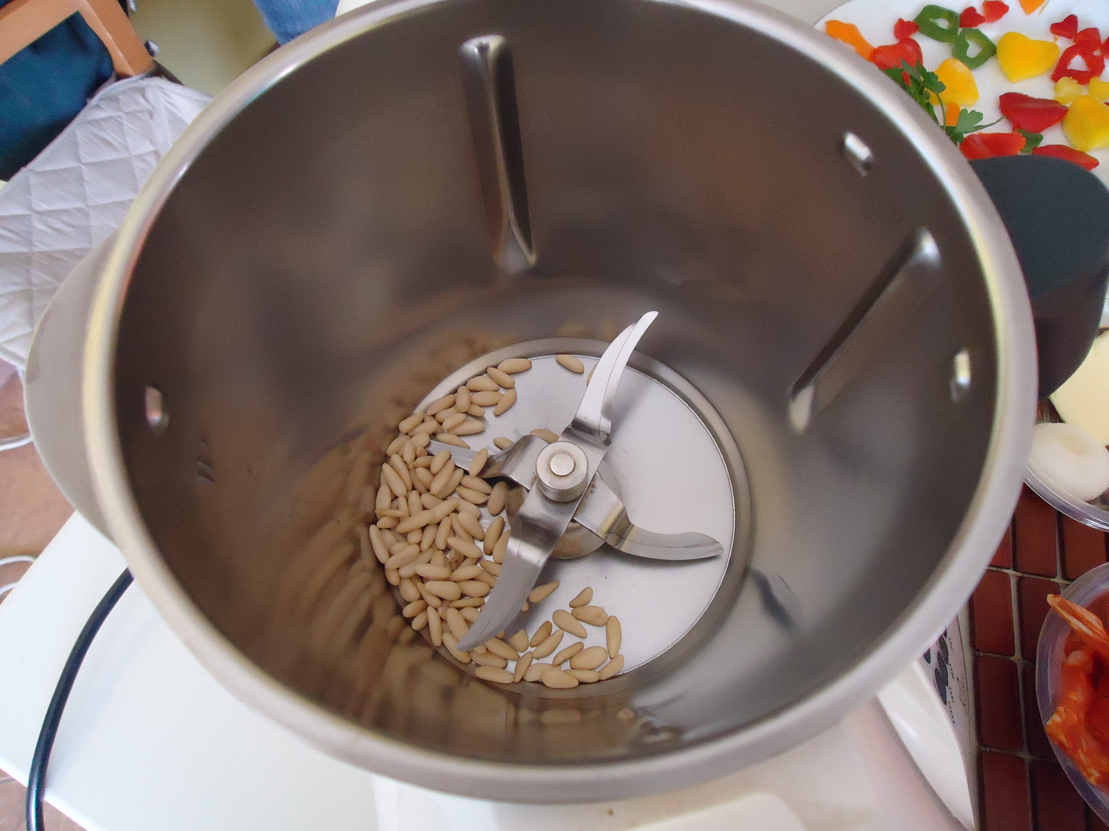 Far tostare i pinoli per 5 min. 100° antiorario vel. 1. Togliere e mettere da parte. Inserire nel boccale la cipolla e tritare 5 sec. vel.7. Aggiungere 30 g di burro e rosolare 3 min. 100° vel.1. Inserire metà dei peperoni tagliati a listarelli e sfumare con il vino per altri 3 min.100° vel.1 antiorario. Inserire il riso e tostare 3 min. 100° antiorario vel.1. Aggiungere l'acqua, salare e cuocere 20 min vel.1 antiorario 100°. A metà cottura inserire il salame spezzettato. Infine mantecare con 20 gr. di burro e i pinoli tostati. Decorare con i cuoricini di peperoni ricavati dai mezzi peperoni.