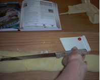 Riprendete l'impasto lievitato e stendetelo in un rettangolo spesso 3 millimetri senza lavorarlo (lo spianate soltanto).