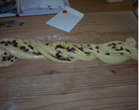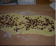 Stendete sopra l'uvetta e i canditi e arrotolate strettamente formando un lungo rotolo